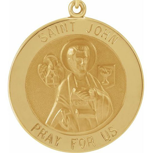 This tiny St John the Evangelist medal is made of solid 14k yellow gold. Inscription reads: SAINT JOHN PRAY FOR US. This item is half the height of a quarter. Weighs approximately 0.8 grams. Fits up to a 2mm wide chain. Made in USA. Available while supplies last.