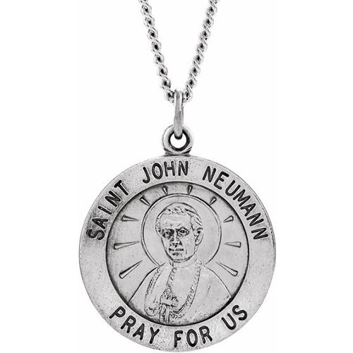 Polished sterling silver medal with matching 18-inch chain. Inscription reads: SAINT JOHN NEUMANN PRAY FOR US. Weighs 1.56 DWT (2.42 grams). Please note: weight is approximate, actual weight may vary.