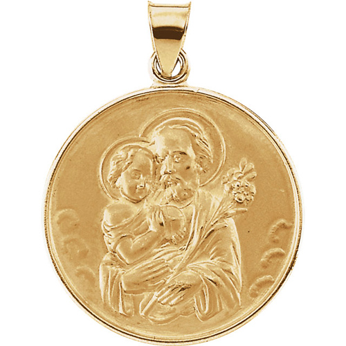 This very small round St Joseph medal is made of polished 18k yellow gold. This item is half the height of a quarter. Diameter: 1/2in. Weighs 1.52 grams. Please note: weight is approximate, actual weight may vary. Chain not included.