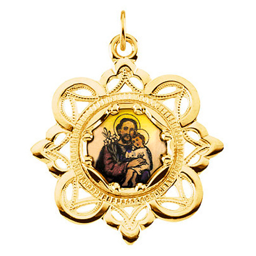 Polished 10k yellow gold medal. Enamel portrait of St. Joseph with Child. Item size: 1in x 1in without jump ring. Weighs 2.85 grams. Please note: weight is approximate, actual weight may vary. Chain not included.