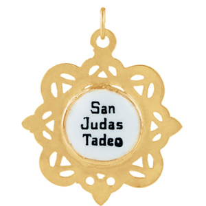 Framed enamel St Jude pendant is made of polished 10kt yellow gold. This item is the size of a quarter. Weighs 2.67 grams. Please note: weight is approximate, actual weight may vary. Chain not included.
