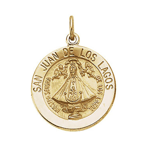 This small San Juan de Los Lagos medal is made of solid polished 14k yellow gold. Inscription reads: SAN JUAN DE LOS LAGOS. Item size: 15mm, smaller than a dime. Weighs 1.3 grams. Please note: weight is approximate, actual weight may vary. Chain not included. Made in USA.