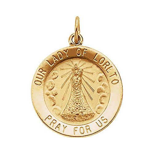 This round, die struck Lady of Loreto medal is made of polished 14kt yellow gold. Diameter: 15mm. This item is slightly smaller than a dime. Inscription reads: OUR LADY OF LORETO PRAY FOR US. Weighs 1.24 grams. Made in the USA.