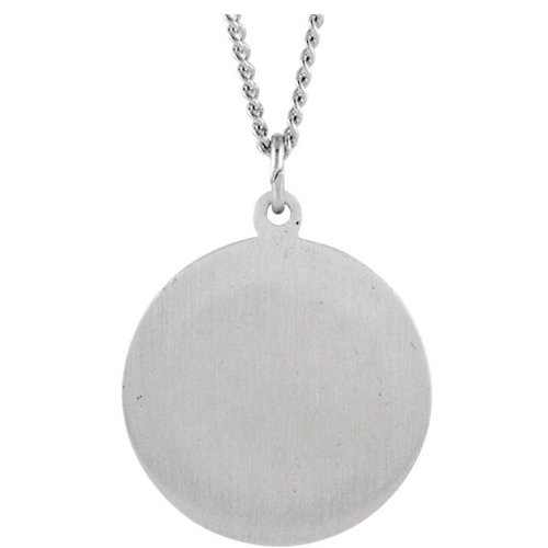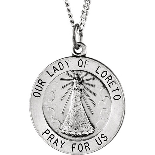 Sterling silver round Lady of Loreto medal includes a matching 18-inch chain. Medal size: 18.25mm. Inscription reads: OUR LADY OF LORETO PRAY FOR US. This item is slightly larger than a dime. Weighs 2.18 grams. Made in the USA.