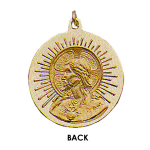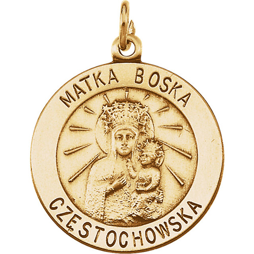 This small round Matka Boska medal is made of polished solid 14k yellow gold. Medal diameter: 15mm. Inscription: MATKA BOSKA CZESTOCHOWSKA. This medal is smaller than a dime. Fits up to a 2.5mm wide chain. Weighs approximately 1.53 grams. Made in USA. Available while supplies last.