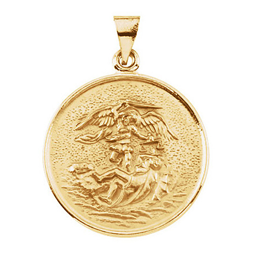 This round St Michael medal is made of polished 18kt yellow gold. Diameter: 24.5mm. The medal is the size of a quarter. Die struck. Approximate weight: 7.47 grams. Made in USA.