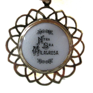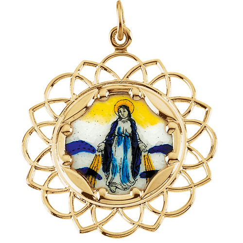 Milagrosa framed enamel and porcelain pendant has a 10kt yellow gold fancy frame. Item size: 26mm x 26mm. This item is slightly larger than a quarter. Weighs 3.16 grams. Please note: weight is approximate, actual weight may vary. Chain not included.