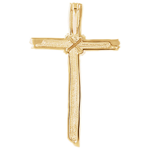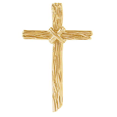 This large woodgrain cross is made of polished solid 14k yellow gold. Part of the Crown of Thorns collection by Brad Fergusion. Dimensions: 50.75mm x 32.25mm. Hidden bail fits up to a 3.5mm wide chain. Approximate weight: 7.31 grams. Made in USA.