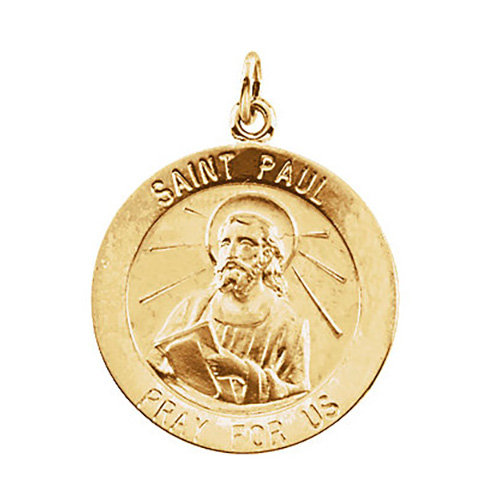 This round St. Paul medal is made of polished 14kt yellow gold. This item is the size of a dime and weighs 2.49 grams. Inscription reads: SAINT PAUL PRAY FOR US. Item diameter: 18mm. Fits up to a 2mm wide chain. Please note: weight is approximate, actual weight may vary. Chain not included.