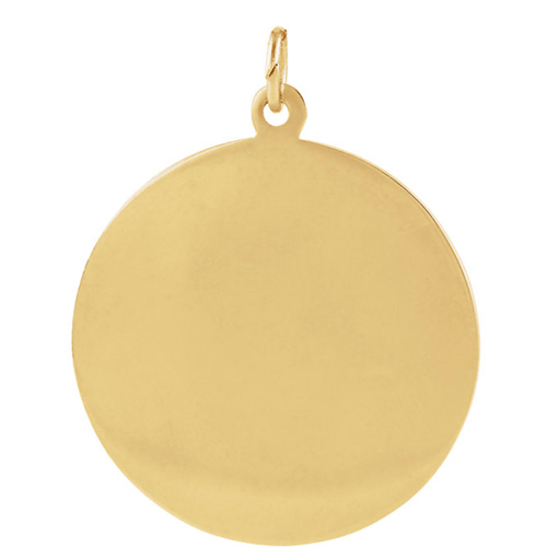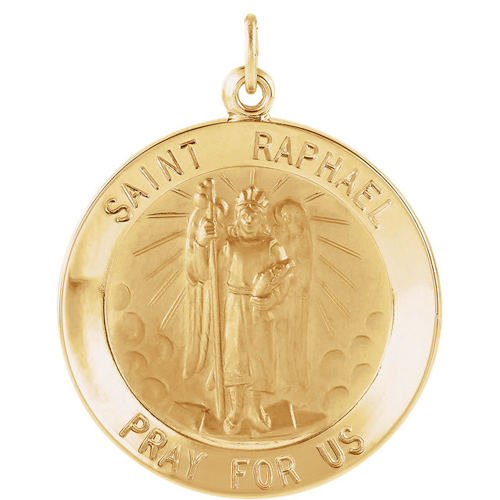 St Raphael round medal is made of polished 14kt yellow gold. Item diameter: 18mm, the size of a dime. Inscription reads: SAINT RAPHAEL PRAY FOR US. Weighs 2.16 grams. Please note: weight is approximate, actual weight may vary. Chain not included.