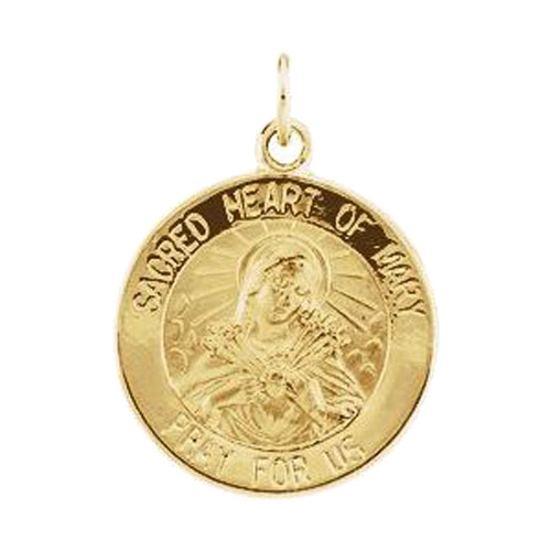 This small round sacred heart of Mary medal is made of solid 14k yellow gold. Item size: 15mm. Inscription: SACRED HEART OF MARY PRAY FOR US. Fits up to a 2mm wide chain. Weighs approximately 1.69 grams. Made in USA.