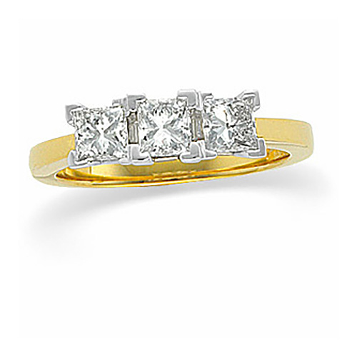 Polished 14kt yellow gold band with white prongs and baskets. Ring weighs approximately 3.40 DWT (5.29 grams) Diamond details: One .50CT square princess cut diamond, clarity SI, color GHI. Two .37CT square princess cut diamonds, clarity SI, color GHI.