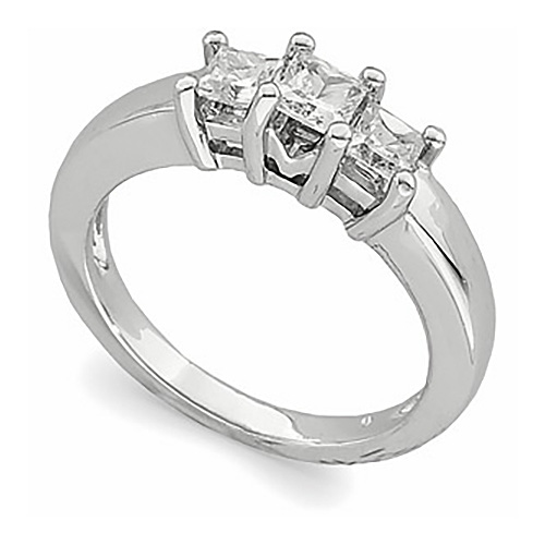 Polished 14kt white gold. Ring weighs approximately 3.49 DWT (5.43 grams) Diamond details: One 3.5mm square princess cut diamond, clarity SI, color GHI. Two 3.0mm square princess cut diamonds, clarity SI, color GHI.