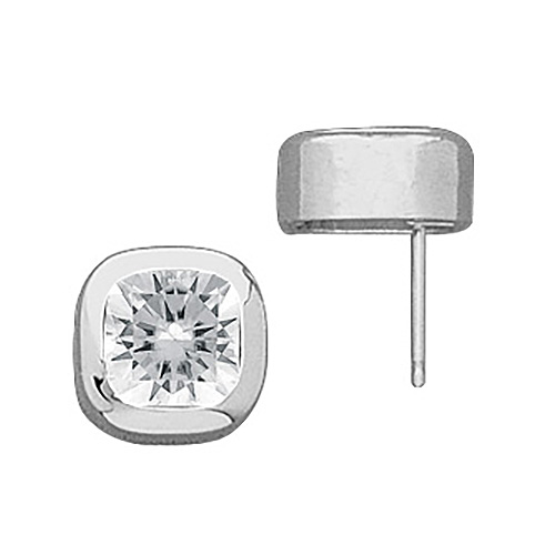 Another Joy Jewelers exclusive! Semi-polished 14kt white gold. Each earring dazzles with a 8x8mm cushion cut moissanite jewel. Bezel set. Vintage looks, modern technology meet in these antique bezel set earrings.
