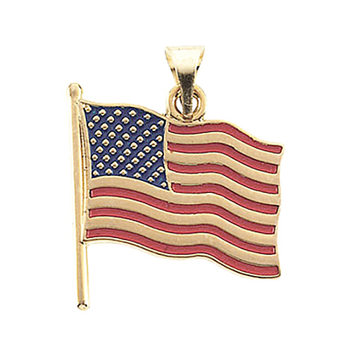 American flag pendant with blue and red enamel is made of polished 14kt yellow gold. This item is slightly smaller than a dime. Item size: 17.5mm x 17mm. Weighs 2.77 grams. Please note: weight is approximate, actual weight may vary.