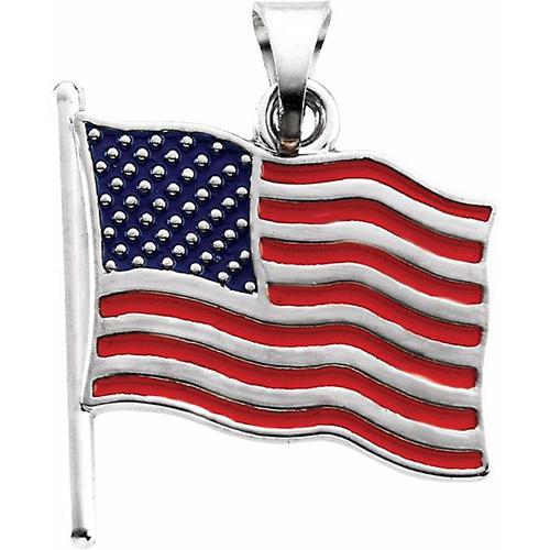 Polished 14k white gold American flag pendant has red and blue enamel. This pendant is slightly smaller than a dime. Weighs 2.77 grams. Please note: weight is approximate, actual weight may vary.
