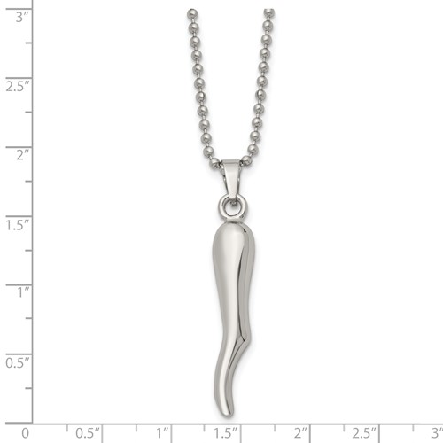 Polished stainless steel Italian horn necklace on 22 inch bead chain. Pendant length: 1 1/4 inches. Fancy lobster clasp. Made of grade 316 stainless steel, known for its superior corrosion resistance. Stainless steel will not oxidize [rust] nor turn black. Imported.