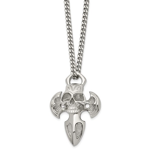 Polished stainless steel skull cross necklace dangles from a 24 inch stainless steel curb chain. Fancy lobster clasp. 1 3/8 inch width x 1 5/8 inch height. Grade 316 stainless steel. Imported.