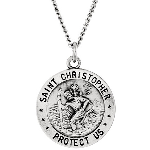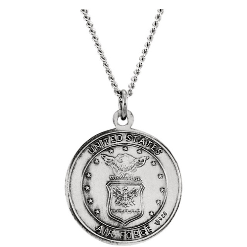 Polished, solid sterling silver St Christopher medal includes matching 18-inch flat curb chain. Inscription: SAINT CHRISTOPHER PROTECT US. Reverse side: UNITED STATES AIR FORCE. This medal is the size of a dime, and weighs approximately 7.17 grams.