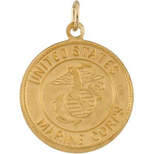 Polished, solid 14kt yellow gold medal. Inscription: SAINT CHRISTOPHER PROTECT US. Reverse side: UNITED STATES MARINE CORPS. This medal is the size of a dime, and weighs approximately 4.99 grams. Chain not included.