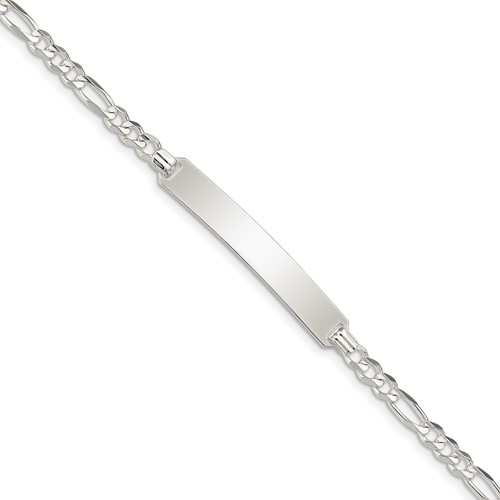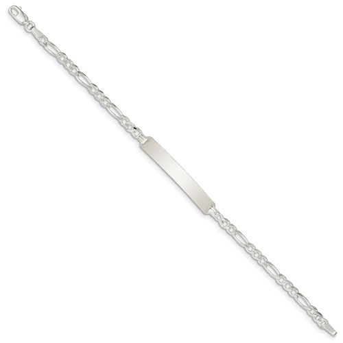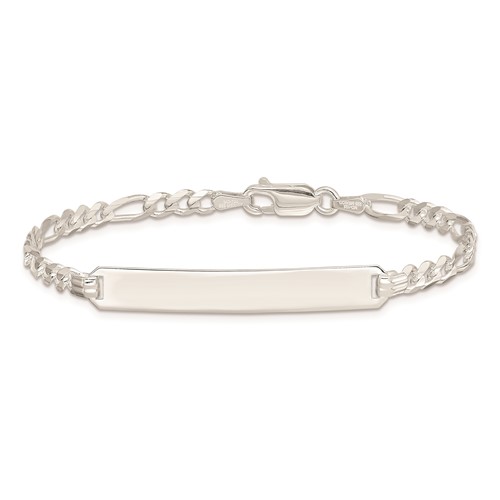 Engravable bracelet plate is 37 x 6mm. Figaro links are 4mm wide. Length: 8 inches. Weight: 6.09 grams. Lobster clasp. Made in Mexico.