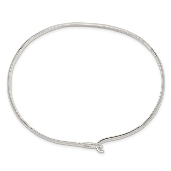 This sterling silver flexible bangle bracelet has a hook and large circular clasp. 3.75mm wide. One size fits most. Weight: 7.4 grams. Import.