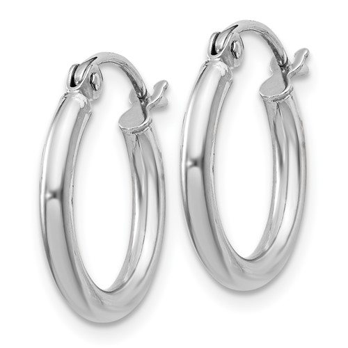 These small round hoop earrings are made of polished sterling silver. Earrings measure 5/8in x 5/8in. These earrings are smaller than a dime. Thickness: 2mm. Hinged post. Weight: 1.11 grams. Made in USA.
