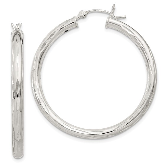 Diamond-cut satin polished hoop earrings are made of sterling silver. Earring measures 1 1/2 inches tall. Approximate weight: 4.69 grams. Made in India. Ships from USA.
