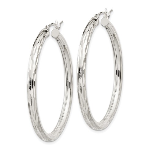 These large diamond-cut satin and polished hoop earrings are made of sterling silver. Earring measures 1 1/2 inches tall. Approximate weight: 5.1 grams. Made in India. Ships from USA.