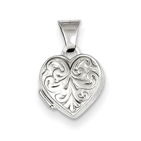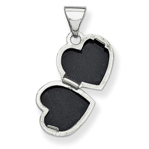 This tiny heart locket is made of sterling silver. Item size: 5/16 inch tall by 5/16 inch wide without the bail. This item is half the size of a dime. Weight: 0.56 grams.