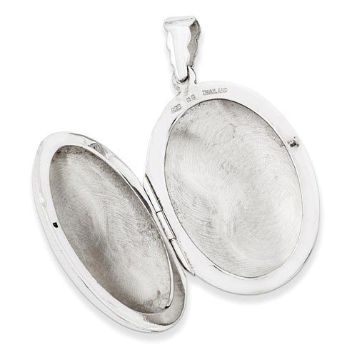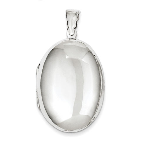 This locket is made of polished sterling silver. This jumbo oval locket measures 1 1/2 inch tall by 1 inch wide without the bail. Thhis item is not engravable. Weight: 8.1 grams. Chain not included.