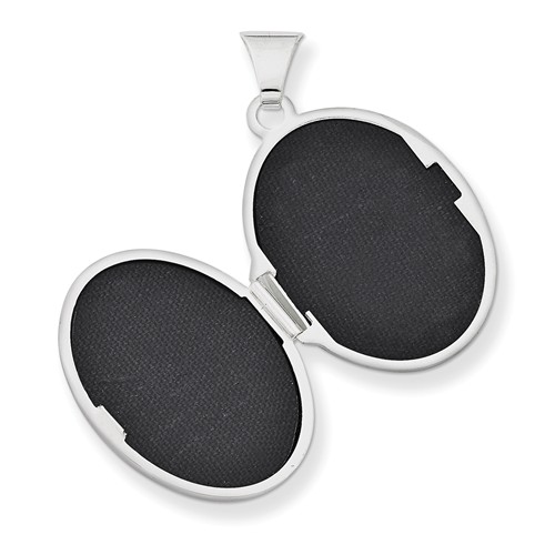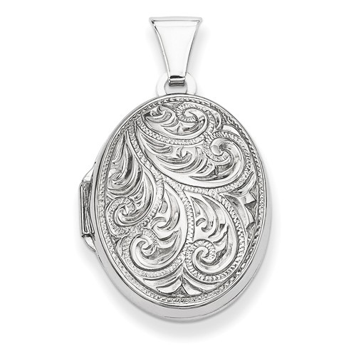 This scroll design oval locket is made of polished sterling silver. Measures 3/4 inch tall by 9/16 inch wide without the bail. This item is slightly larger than a penny. Weight: 1.8 grams. Made in USA.