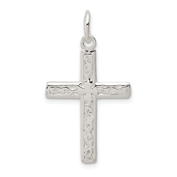 Sterling silver Latin cross pendant has a polished textured finish. Item size: 1 inch tall by 11/16 inch wide. This item is larger than a quarter. Flat back, chain not included. Weight: 1.5 grams. Import.