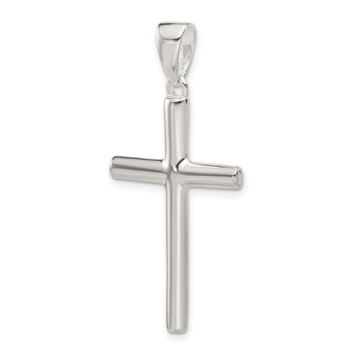 This sterling silver hollow Latin cross pendant has rounded edges. 1 3/8 inch tall by 7/8 inch wide without bail. Weight: 1.1 grams. Import.