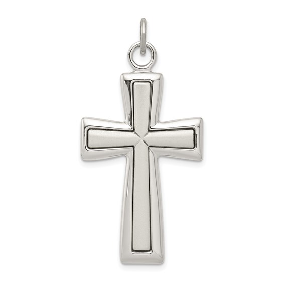 Sterling silver latin cross has a polished and brushed finish with antiquing. Measures 1 1/4 inch tall by 13/16 inch wide without bail. This item is slightly larger than a quarter. Weight: 5.59 grams. Made in the USA. Satin back.