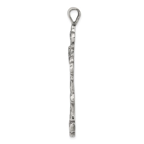 Sterling silver diamond cut cross has a textured back and measures 2in x 1 1/4in wide without bail. Chain not included. Weight: 7.3 grams.