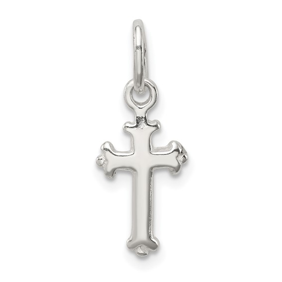 This smooth fleur de lis cross charm is made of polished sterilng silver. Measures 1/2 inch tall by 5/16 inch wide without bail. Weight: 0.5 grams. As a royal symbol of France the fleur de lis and its likeness are used as a symbol of the Virgin Mary, Queen of Heaven.