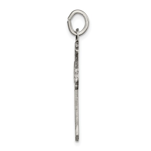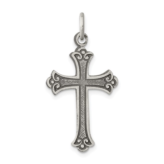 This solid sterling silver budded cross pendant has an antiqued finish. Measures 1 inch tall by 5/8 inch wide without bail. Chain not included.