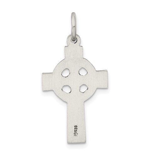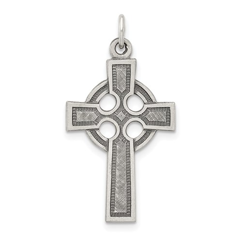 This ladies' Celtic and Iona cross pendant is made of solid sterling silver. Measures 7/8 inch tall by 9/16 inch wide without bail. This item is the size of a nickel. Fits up to a 2.5mm wide chain. Originating in Ireland and taken to the Island of Iona by St. Columbia, the circle around the cross symbolizes eternal life.