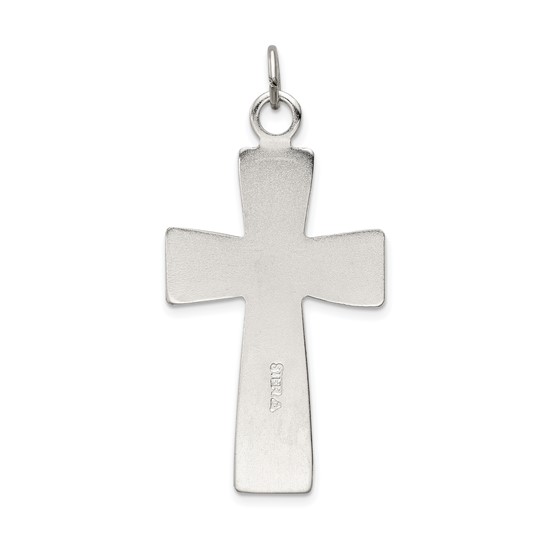 Solid sterling silver INRI crucifix pendant has a tapered shape and antique finish. Dimensions: 1 1/2in x 7/8in. Weighs 6.19 grams. Die struck. Fits up to a 3mm wide chain. Made in the USA.