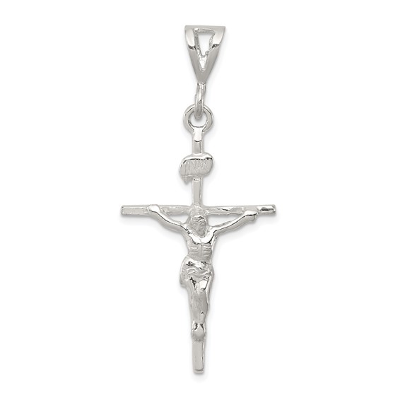 This large, slender INRI crucifix is made of sterling silver. Item size: 1 1/4 inch tall by 13/16 inch wide without bail. Weight: 3.2 grams. Crosses with a representation of the body of Christ, or corpus, are crucifixes and recall the death and resurrection of Christ.