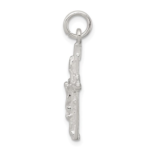 Sterling silver crucifix pendant has a textured finish. Weight: 1.2 grams. Measures 3/4 inch tall by 1/2 inch wide without bail. This item is slightly larger than a penny. Fits up to a 2.5mm wide chain. Crosses with a representation of the body of Christ, or corpus, are crucifixes and recall the death and resurrection of Christ. Made in India. Ships from USA.
