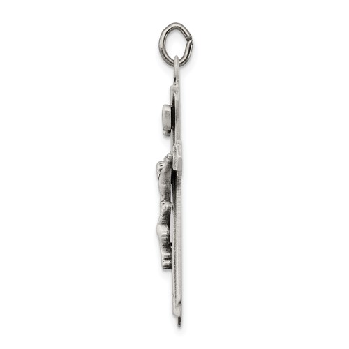 Sterling Silver Antiqued Crucifix Pendant. Measures 1 1/8 inch tall by 5/8 inch wide without bail. Weight: 1.85 grams. Crosses with a representation of the body of Christ, or corpus, are crucifixes and recall the death and resurrection of Christ. Chain not included.