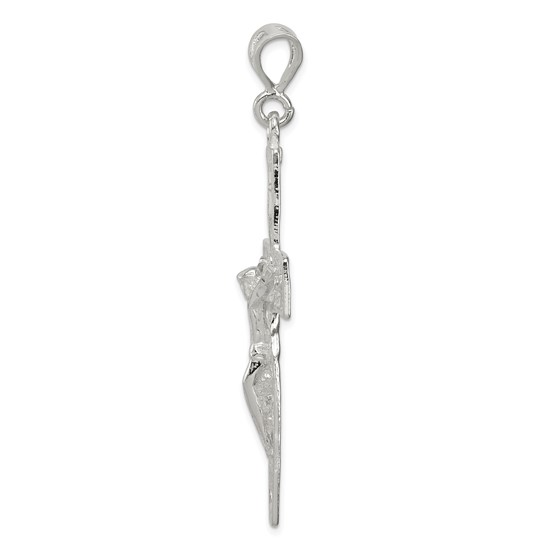 Cut-out crucifix pendant is made of polished sterling silver. Item size: 2in by 1 1/4in without bail. Bail dimensions: 6.5mm x 4.5mm. Fits up to a 4mm wide chain. Weight: 5.8 grams. Crosses with a representation of the body of Christ, or corpus, are crucifixes and recall the death and resurrection of Christ. Chain not included.