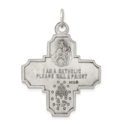 Sterling silver four-way medal. Weight: 5.46 grams. Antiqued. Measures 1 1/8 inch tall by 1 1/16 inch wide without bail. Chain not included. Inscription on back: I AM A CATHOLIC. PLEASE CALL A PRIEST.