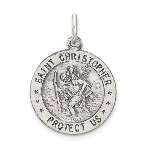 This round St. Christopher and baseball medal is made of antiqued sterling silver. This item is the size of a dime. Weight: 2.22 grams. Chain is not included.