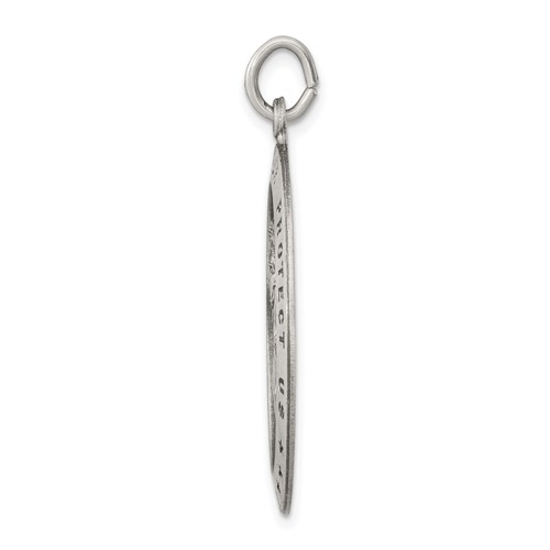 This men's sterling silver St. Christopher medal has a satin and antique finish. Measures 1 1/8 inch tall by 3/4 inch wide without bail. Chain not included. Back is engravable upon request. Jump ring dimensions: 4mm x 3.4mm. We recommend a chain no wider than 3mm. Made in USA.