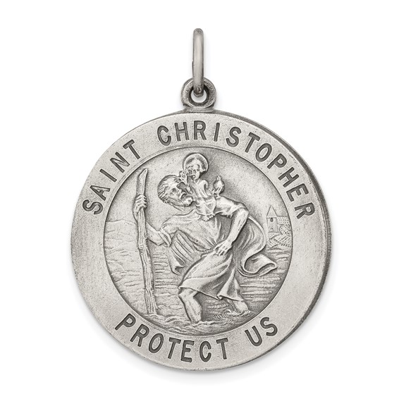 This sterling silver round St. Christopher medal has an antique finish. Polished and satin accents. Measures 15/16 inch tall by 15/16 inch wide without bail. This item is slightly smaller than a quarter. Chain not included. Weight: 6.09 grams. Made in the USA.