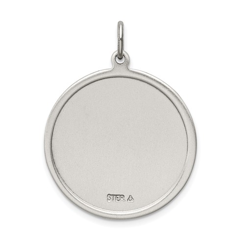 Solid sterling silver St. Christopher medal has a satin finish. Item size: 1 inch tall by 1 inch wide without bail. This item is the size of a quarter. Antiqued. Fits up to a 2.5mm wide chain. Weight: 7.69 grams. Made in USA.