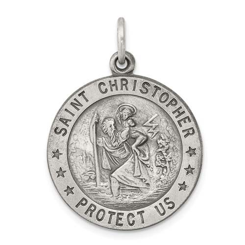 Sterling silver round St. Christopher medal has an antique finish. Measures 3/4 inch tall by 3/4 inch wide without bail. Chain not included. This item is slightly larger than a penny. Die struck. Made in USA.